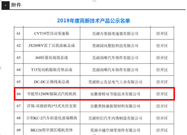 2020年1月6日,安徽省高新技術產品認定名單正式公布。我公司產品節能型12MW抽凝式汽輪機組喜獲認定,這次獲得高新技術產品認定再一次驗證了安徽譽特雙的卓越品質,同時也是對我司產品權威的肯定!