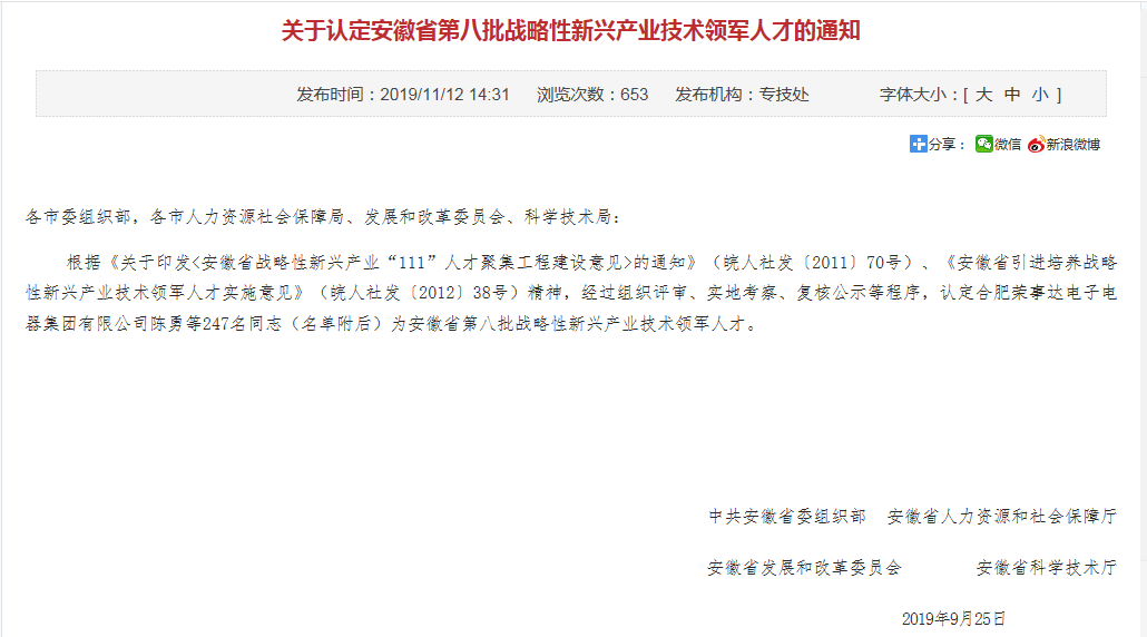 2019年11月12日,經(jīng)中共安徽省委組織部、安徽省人力資源和社會保障廳、安徽省發(fā)展和改革委員會、安徽省科學(xué)技術(shù)廳四部門聯(lián)合發(fā)文“經(jīng)過組織評審、實地考察、復(fù)核公示等程序,認定安徽省第八批戰(zhàn)略性新興產(chǎn)業(yè)技術(shù)領(lǐng)軍人才名單,正式予以公布?!?/span>