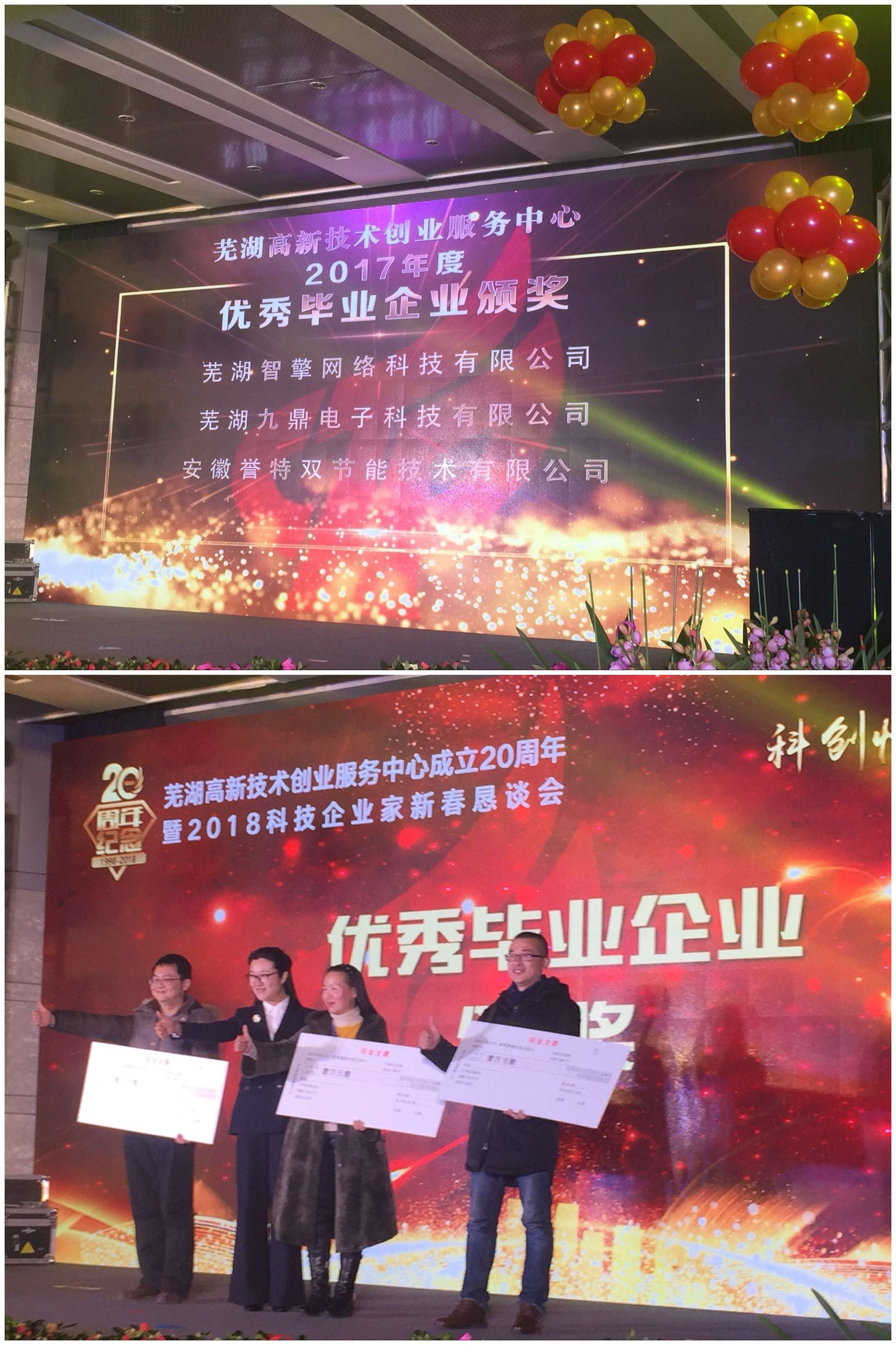 近日,我公司安徽譽特雙節能技術有限公司,榮獲蕪湖市國家級高新技術創業園區“2017年優秀畢業創業企業”榮譽稱號。