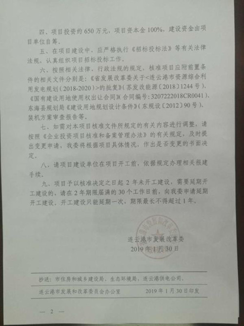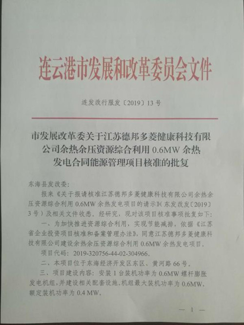 該項目當前進展順利,經大力推動,已順利獲取《江蘇省發展改革委關于<連云港市資源綜合利用發電規劃(2018-2020)>的批復》(蘇發改能源〔2018〕1244號)、《連云港市發展改革委關于江蘇德邦多菱健康科技有限公司余熱余壓資源綜合利用0.6MW余熱發電合同能源管理項目核準的批復》(連發改行服發〔2019〕13號)、《東海縣發改委關于報請核準江蘇德邦多菱健康科技有限公司余熱余壓資源綜合利用0.6MW余熱發電項目的請示》(東發改發〔2019〕3號)、《裝機方案審查報告》等文件和項目核準批文。