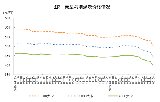 煤炭進(jìn)口增長(zhǎng)較快,交易價(jià)格有所下跌。4月份,進(jìn)口煤炭3095萬(wàn)噸,同比增長(zhǎng)22.3%;1—4月份,進(jìn)口煤炭1.3億噸,同比增長(zhǎng)26.9%。港口煤炭綜合交易價(jià)格繼續(xù)下跌,5月8日秦皇島港5500、5000和4500大卡煤炭?jī)r(jià)格分別為每噸501元、442元和396元,比4月3日分別下跌39元、41元和36元。