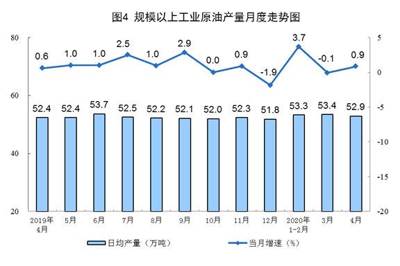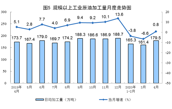 原油生產(chǎn)平穩(wěn),加工量由降轉(zhuǎn)增。4月份,生產(chǎn)原油1587萬(wàn)噸,同比增長(zhǎng)0.9%,增速由負(fù)轉(zhuǎn)正,上月為下降0.1%,日均產(chǎn)量52.9萬(wàn)噸;加工原油5385萬(wàn)噸,同比增長(zhǎng)0.8%,上月為下降6.6%,日均加工179.5萬(wàn)噸。1—4月份,生產(chǎn)原油6444萬(wàn)噸,同比增長(zhǎng)2.0%;加工原油20348萬(wàn)噸,同比下降3.4%。