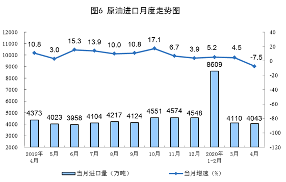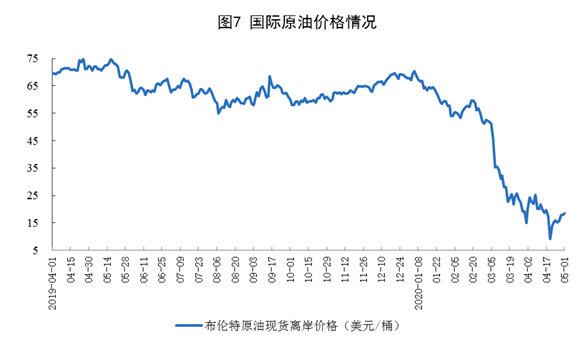 原油進(jìn)口下降,國(guó)際原油價(jià)格低位震蕩。4月份,進(jìn)口原油4043萬(wàn)噸,同比下降7.5%。1—4月份,進(jìn)口原油16761萬(wàn)噸,同比增長(zhǎng)1.7%。4月30日布倫特原油現(xiàn)貨離岸價(jià)格為18.11美元/桶,比3月31日的14.85美元/桶上漲22.0%。