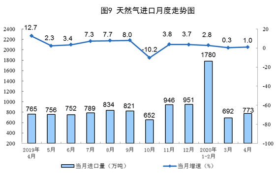 天然氣進(jìn)口小幅增長(zhǎng)。4月份,進(jìn)口天然氣773萬(wàn)噸,同比增長(zhǎng)1.0%。1—4月份,進(jìn)口天然氣3233萬(wàn)噸,同比增長(zhǎng)1.5%。