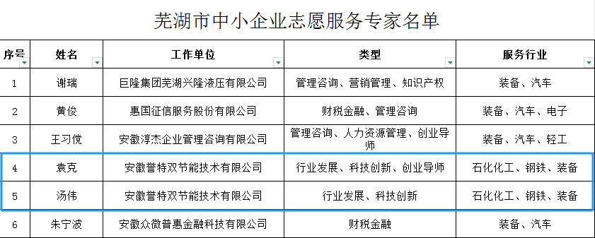 2025年3月6日,為完善蕪湖市中小企業服務體系建設,促進中小企業發展,為中小企業提供優質高效的服務,由市工信局牽頭在全市范圍內開展志愿專家征集評選工作,并最終確定52名各行業人員組成志愿專家團,我公司總經理袁克、節能事業部長湯偉兩位同志入選,在此表示熱烈祝賀。